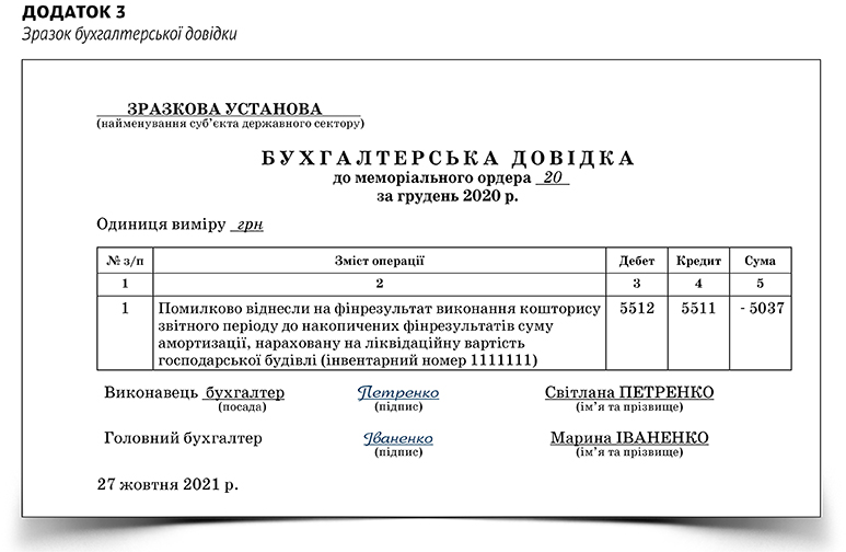 У 2020 році нарахували амортизацію на ліквідаційну вартість господарської будівлі в сумі 5037 грн. Коли складали документи на передачу господарської будівлі, виявили цю помилку. Така помилка впливає на дані трьох меморіальних ордерів, тому потрібно скласти три бухгалтерських довідки. Що прописати у таких довідках — дивіться в Додатках 1–3.