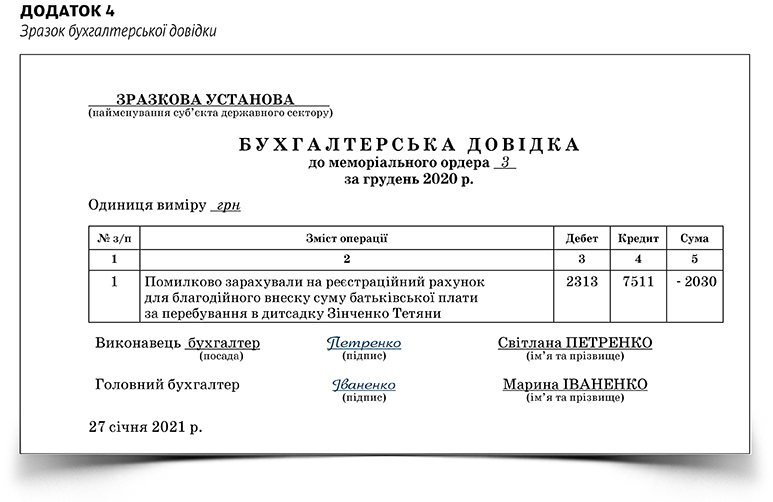 Бухгалтер виявив, що в грудні 2020 року за перебування дитини в дитсадку батьки сплатили 2030 грн не на спеціальний реєстраційний рахунок, призначений для того, щоб зараховувати кошти батьківської плати, а на рахунок закладу з обліку надходження благодійних внесків. У січні ці кошти були перераховані з реєстраційного рахунку для благодійних внесків на реєстраційний рахунок для батьківської плати. Як скласти бухгалтерські довідки, щоб випрати цю помилку, — в Додатках 4–5. Бухгалтерську довідку для коригування накопичених фінрезультатів складайте за зразком, наведеним у Додатку 3.