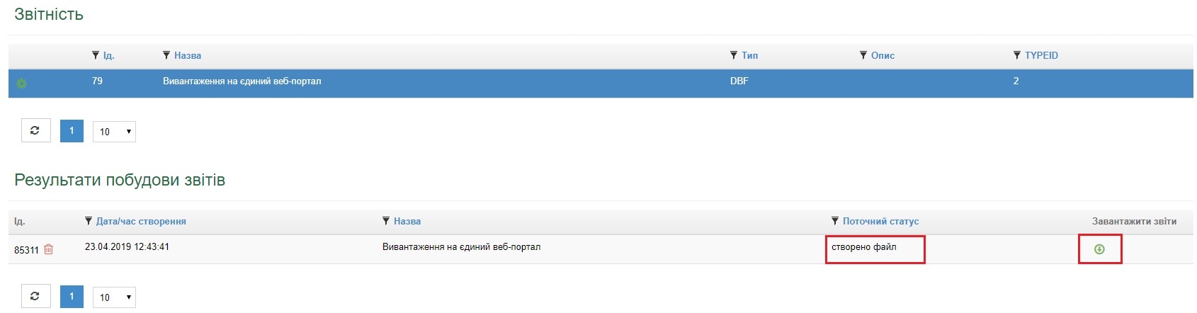 Для формування всіх форм в полі «Звіт» необхідно залишити знак «%» та натиснути «Готово». За результатами буде сформований запит на формування звіту з статусом «Прийнято». Для оновлення статусу формування файлів необхідно натиснути «Оновити». Результатом створення звіту є повідомлення щодо створення файлу, який можливо завантажити на комп’ютер користувача.