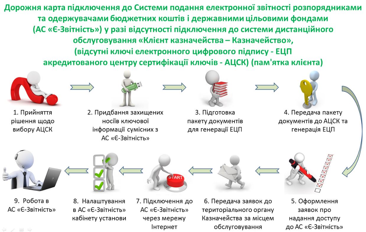 Підключення до АС «Є-Звітність» різниться залежно від того, підключилася чи не підключилися установа до СДО «Клієнт Казначейства – Казначейство», має чи не має вона ключі кваліфікованого електронного підпису іншого Кваліфікованого надавача електронних довірчих послуг (акредитованого центру сертифікації ключів, АЦСК). Тож ДКСУ розробила дорожні карти підключення до АС «Є-Звітність» з урахуванням цих особливостей.
