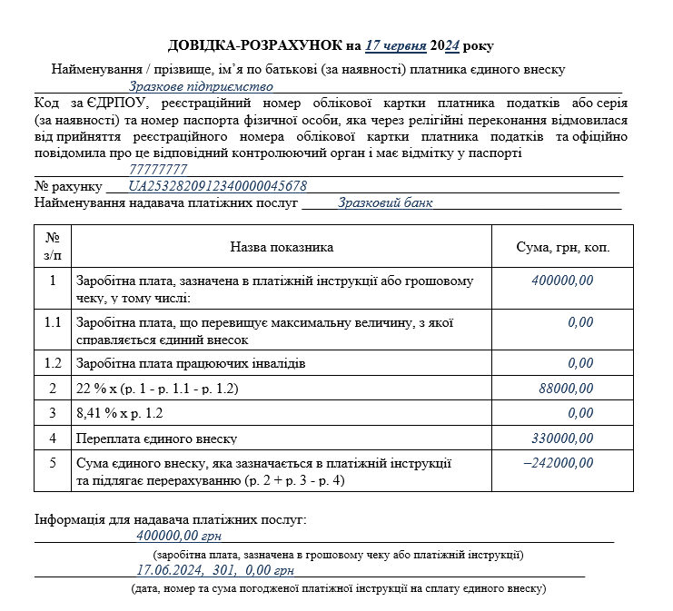 За червень ЄСВ нарахували в загальній сумі 245962,73 грн (1118012,42 грн × 22%). Відповідно сума фактичної переплати, яку потрібно буде зазначати у липневій довідці-розрахунку на 17 липня 2024 року під час виплати авансу (зарплати за першу половину липня), дорівнює: 330000,00 грн – 245962,73 грн = 84037,27 грн. Врахуйте це під час складання довідки-розрахунку за наявності переплати з ЄСВ.
