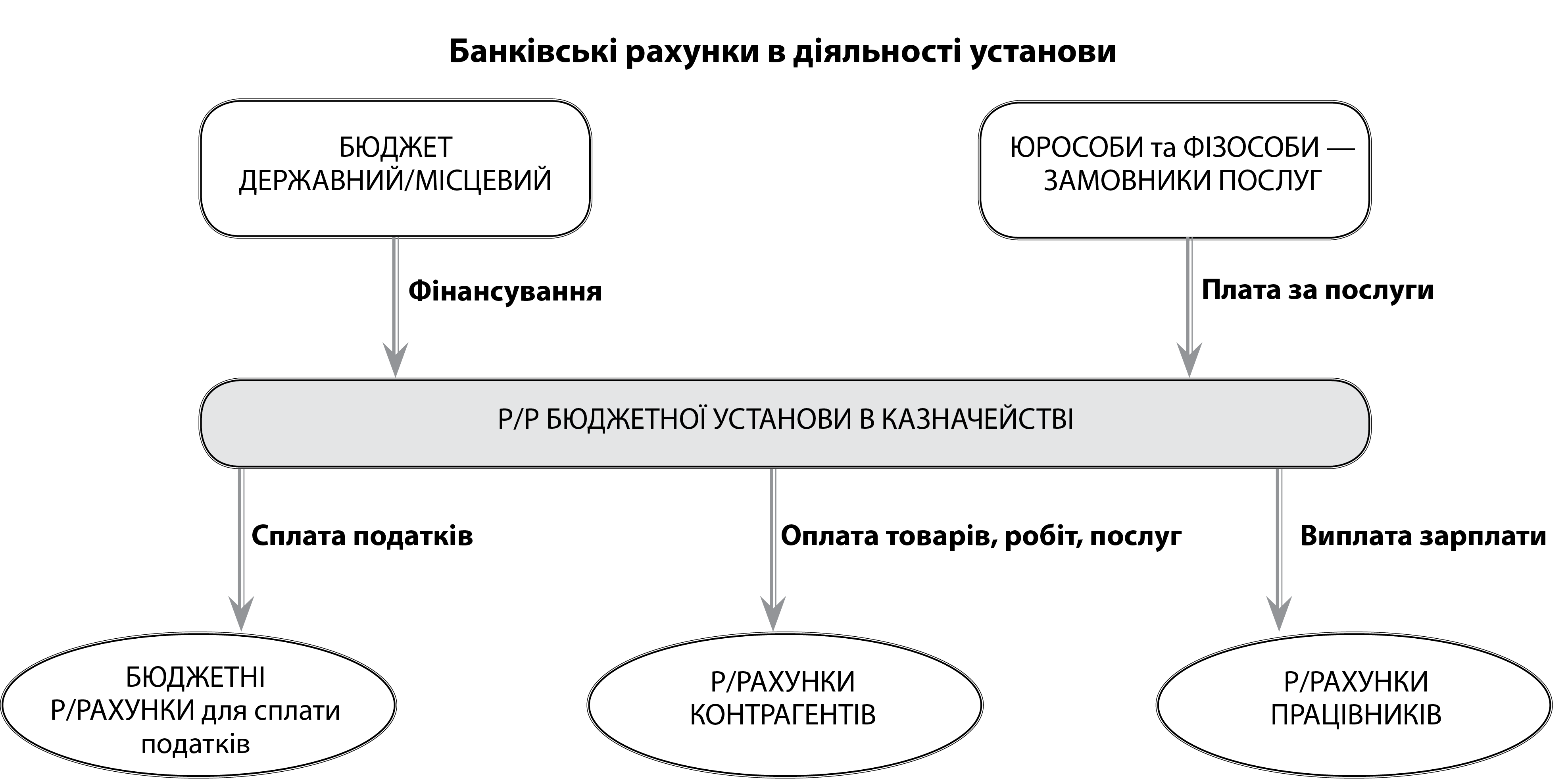 Усі установи господарюють із використанням банківських рахунків (розрахункових рахунків). Мають свої рахунки в Казначействі, на які отримують фінансування, плату за послуги, компенсацію соцзабезпечення тощо, а також проводять платежі на рахунки постачальників товарів, надавачів послуг та виконавців робіт (далі — контрагенти). Окрім того, з цих рахунків перераховують заробітну плату на рахунки працівників, стипендію — на рахунки студентів, податки — на рахунки ДПС (див.схему).
