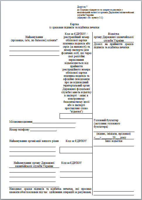 Форму карточки определяет приложение 7 к Порядку открытия и закрытия счетов в национальной валюте в органах Государственной казначейской службы Украины, утвержденном приказом Минфина от 22.06.2012 № 758 (далее — Порядок № 758).