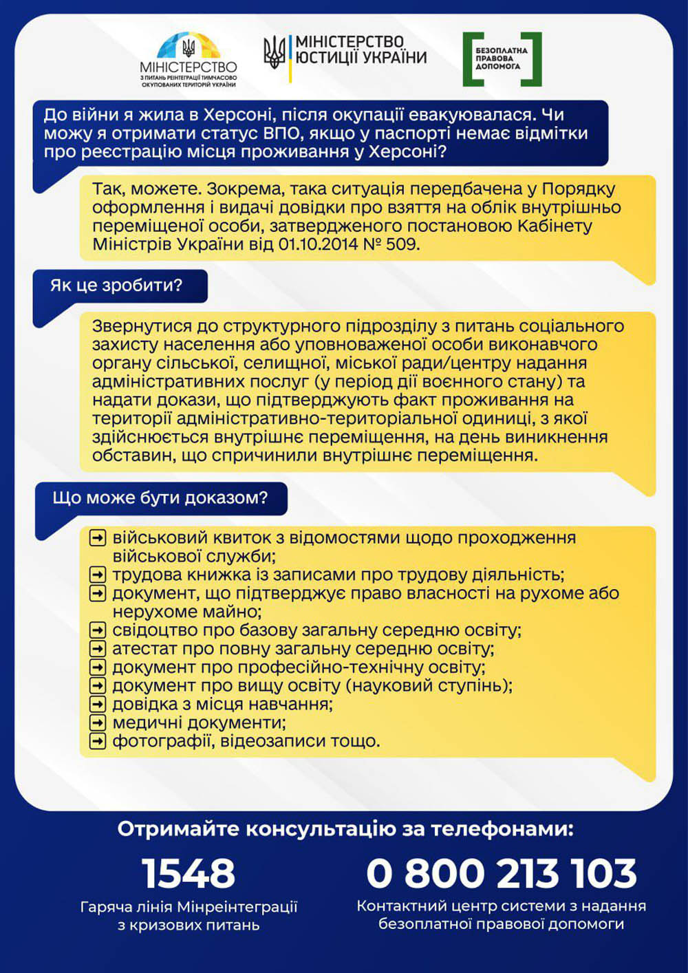 Статус ВПО можна отримати і без офіційної реєстрації місця проживання на ТОТ України.