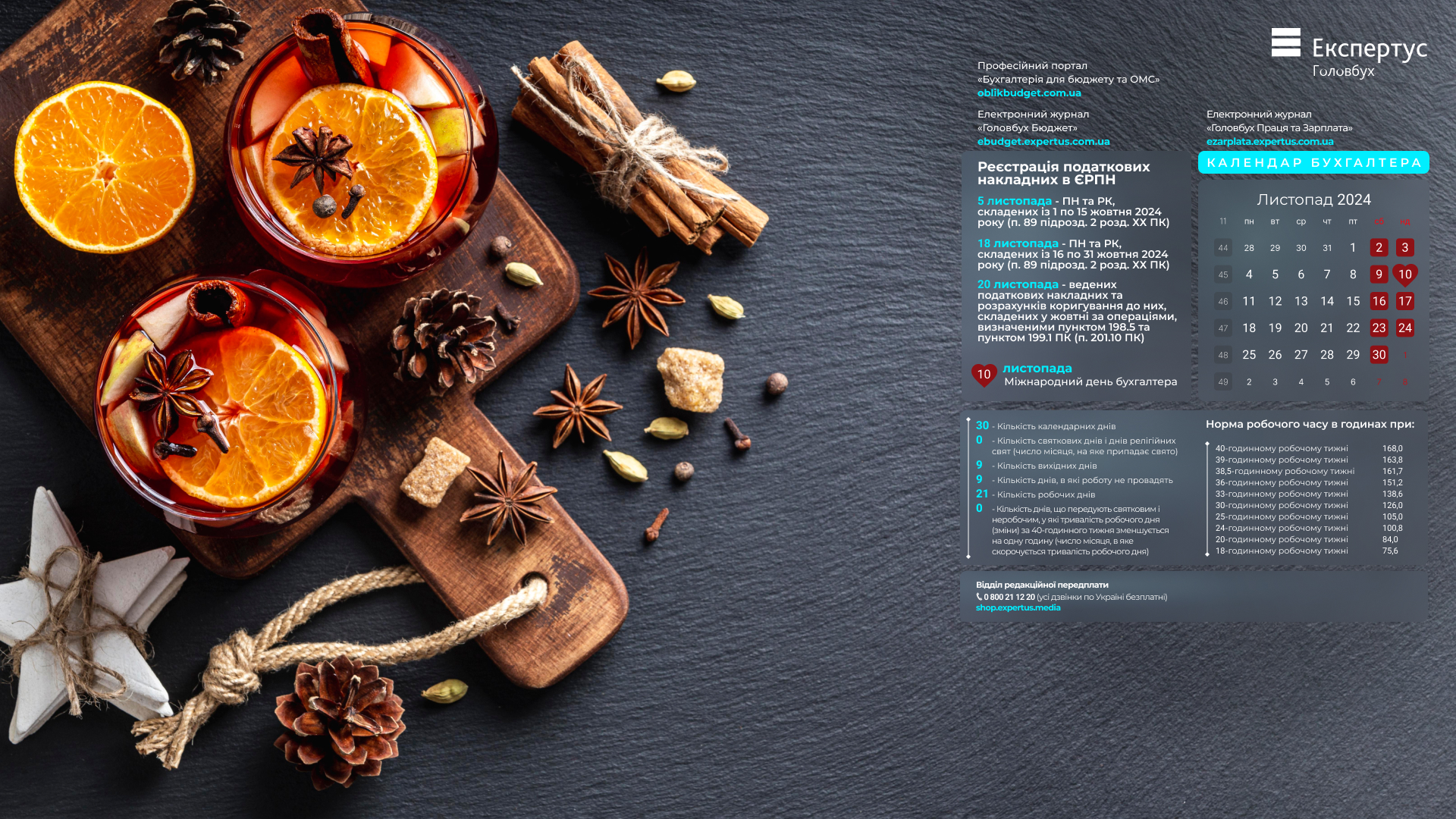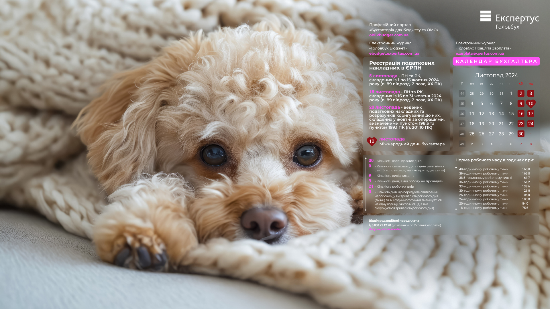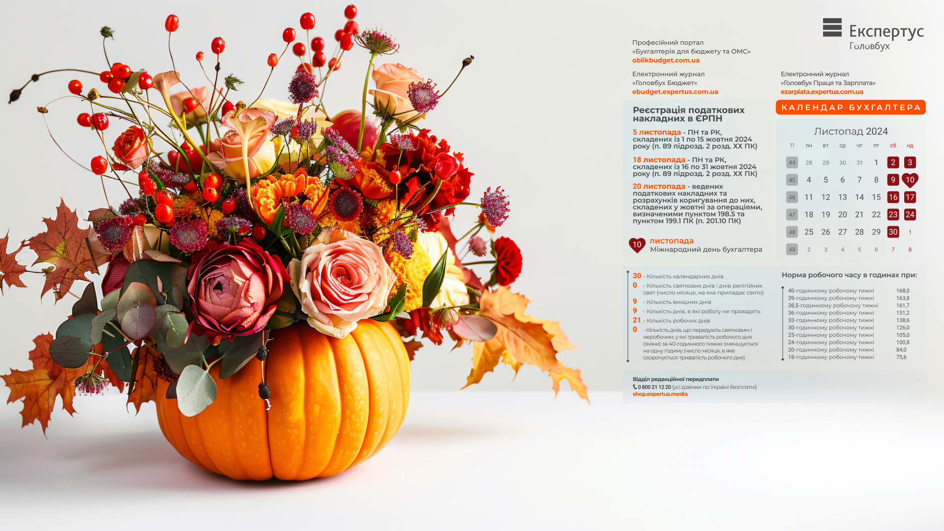 Шановні читачі, редакція нашого порталу та е-журналів «Головбух Бюджет» й «Головбух Праця та Зарплата» підготувала для вас унікальні календарі бухгалтера на листопад 2024 року.
