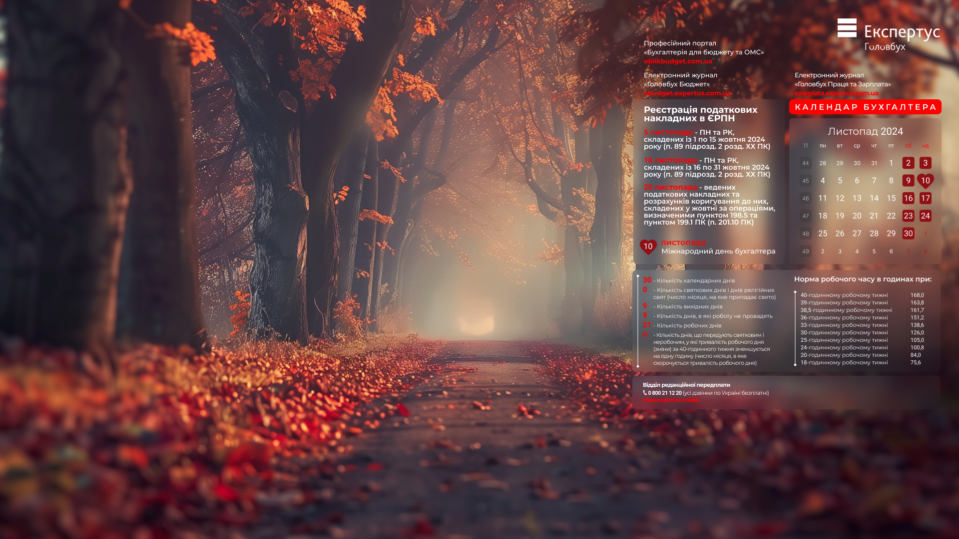 Обирайте та скачайте календар бухгалтера на листопад у вигляді «шпалер» на робочий стіл комп'ютера.
